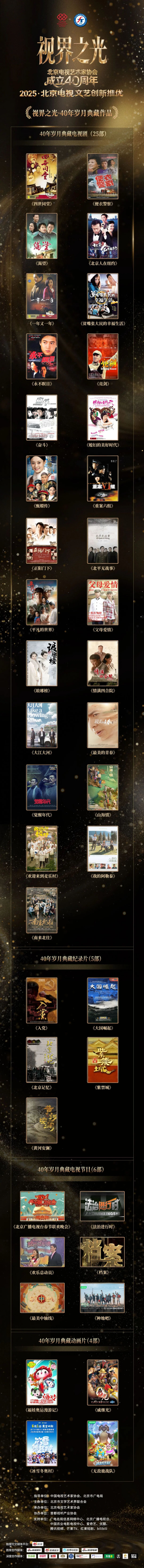 本次活动由中国电视艺术家协会、北京市广电局指导,北京市文联主办,北京电视艺术家协会承办,汇聚了电视行业四代创作者代表。活动揭晓的“40 年・时代印记”典藏作品,旨在遴选四十年间具有标志性意义、承载集体记忆、彰显艺术成就的经典之作,传承电视文艺宝贵的创作经验,向北京电视艺术的辉煌历程致敬。海润影视三部作品的入选,既是行业对其艺术价值的高度认可,也印证了这些作品在观众心中不可替代的时代地位。